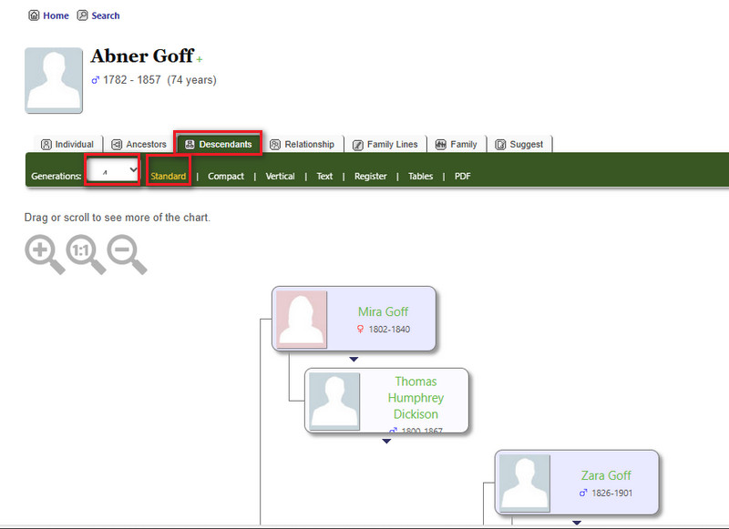 Click on ” Ancestors” and you will find a dynamic chart. The default view is Standard (4 generations). Clicking on any of the names on the chart will take you to the individual sheet for that person.